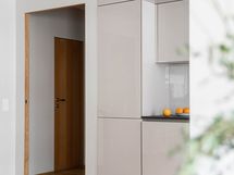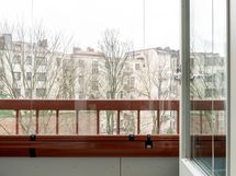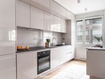 The apartment is located on the fourth floor of the building, easily accessible by an elevator. The bright and spacious floor plan creates a cozy and airy atmosphere. The kitchen seamlessly integrates with the living room, enhancing the feeling of space and creating a cohesive, modern look. A modern fireplace in the living room adds warmth and a cozy ambiance. The bedroom is connected to two walk-in closets, providing ample storage space and adding practicality to daily life. The apartment is crowned by a glazed balcony that opens up to a lush and peaceful courtyard. The balcony is the perfect spot to enjoy your morning coffee or relax at the end of the day.