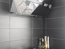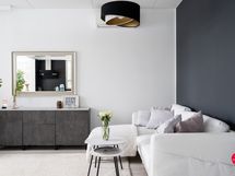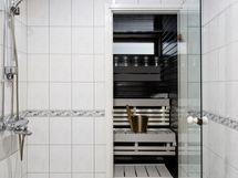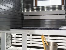 - Kiuas: Sähkökiuas. Kodikas, tummaksi sävytetty sauna, vaaleat lauteet, DROP-designkiuas.