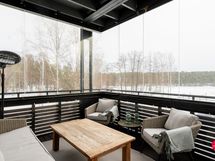 Keittiön yhteydessä valoisa ruokailutila, josta näkymät merelle. Tilasta käynti omalle takapihalle ja terassille, jossa hyvin tilaa grillille ja kesäkeittiön varusteille.