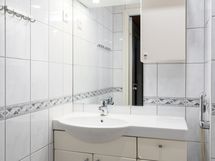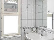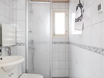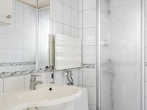 - Pesutilojen varusteet: WC-istuin, suihku, suihkuseinä, pesuallas ja allaskaappi. Pesutilojen kuvaus: Yläkerrassa ikkunallinen kylpyhuone, jossa suihku, pesuallas ja wc-istuin.