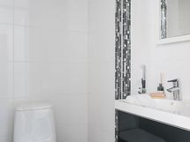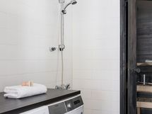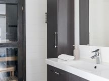 Varustus: suihku, suihkuverhotanko, kaappi, peili, hana, allas, allaskaappi, pesukoneliitäntä. Seinät: maalattu kaakeli. Lattia: maalattu kaakeli. . Erillisen WC:n kuvaus: Eteisessä erillinen wc, joka on uusittu muutamia vuosia sitten. Varustus: wc-istuin, hana, allas, allaskaappi, peili, bideesuihku. Seinät: kaakeli.