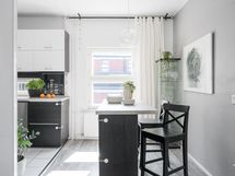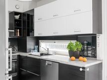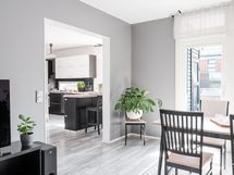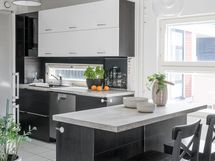 - Varustus: Kaapisto, saareke, inudktioliesi, liesituuletin, hana, allas, astianpesukone, jääkaappipakastin, uuni, mikrovaraus. Seinät: maali. Välitila: välitilalevy. Työtaso: laminaatti. Lattia: kaakeli (lattialämmityksellä).