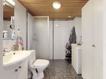 - Pesutilojen kuvaus: lavuaari. Varustus: suihkuseinä, pesukoneliitäntä, lattialämmitys, wc-istuin, suihku, peili, kiinteät valaisimet, kylpyhuonekaapisto.