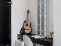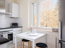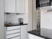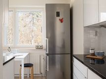 - Parkettilattia, maalatut seinät. Valoiset keittiökaapistot. Uuni, mikroaaltouuni, liesi, liesituuletin, jääkaappi-pakastin ja astianpesukone. Kivitasot. Välitila laattaa.