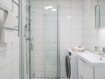 Lattia ja seinät laatoitettu. Allaslaatikosto, peilikaappi, allashana, bideesuihku, suihku ja suihkuseinä. Wc-istuin. Pyyhepatteri ja pesukoneliitäntä.