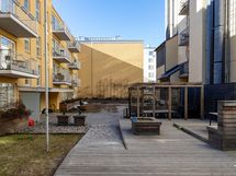 Kodin ehdoton helmi on oma parveke, joka tarjoaa harvinaista yksityisyyttä ja kauniin sisäpihanäkymän. Lisäksi asukkaiden käytössä on poikkeuksellisen laadukkaat yhteiset tilat. Suojaisa ja portilla rajattu sisäpiha toimii kesäisin vehreänä olohuoneena, jossa voi nauttia tunnelmallisista kesäilloista grillin äärellä tai seurata lasten leikkejä. Sijainti keskellä kaikkea, mutta samalla viihtyisällä kadulla, tekee tästä kodista erityisen.