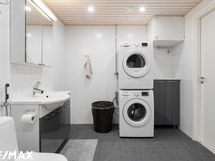 - Pesutilojen varusteet: WC-istuin, suihku, suihkuseinä, peilikaappi, pesuallas, allaskaappi, bidee-suihku, pesukoneliitäntä, lattialämmitys (sähkö) ja pyyhekuivain (vesikiertoinen).