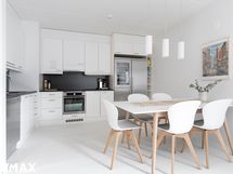 - Keittiön varusteet: Astianpesukone, liesi, erillisuuni (kiertoilma), jääkaappi/viinikaappi/pakastin ja liesituuletin. Liesi: Induktioliesi.