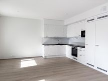 - Keittiössä on induktiokeittotaso, kalustepeitteiset jääkaappi ja pakastin, kalustepeitteinen astianpesukone, kalusteuuni ja integroitu mikroaaltouuni. Keittiön työtason ja seinäkaapiston välitillassa välitilalevy. Keittiön työtasot ovat laminaattia.