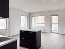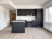 - Keittiössä on induktiokeittotaso, kalustepeitteinen jääkaappipakastin, kalustepeitteinen astianpesukone, kalusteuuni, integroitu mikroaaltouuni ja saareke. Keittiön työtason ja seinäkaapiston välissä on välitilalevy. Keittiön työtasot ovat laminaattia.