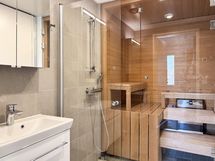 - Suihku, allaskaappi, peilikaappi sekä, pidesuihku, pesukoneliitäntä seinä wc-istuin. Kaikissa kylpyhuoneissa ja erillis-wc:ssä on sähköinen mukavuuslattialämmitys, joka on kytketty asunnon sähköstä.