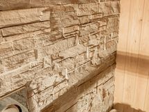 - Ihana, tunnelmallinen sauna, jossa kiukaan tausta sisustuskiveä. Seinät ja katto paneloitu, lattia laatoitettu, lasiovi pesuhuoneeseen.