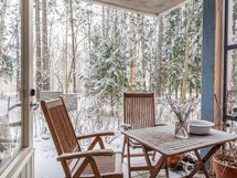 - Oma terassialue talon kulmauksesta, joka on mahdollista halutessa lasittaa. Viereen on istutettu kukkia, marjapensaita. Tässä voit toimia puutarhurina tai piipahtaa aamu-uinnille läheiselle uimarannalle. Meri siintää puiden takaa.
