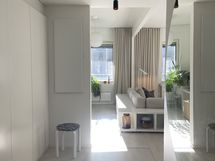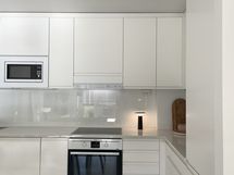 • Keittiössä kestävät ja modernit materiaalit: kokovalkoinen ilme, integroidut kodinkoneet, kvartsikomposiittitaso