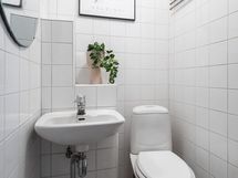 - Pesutilojen varusteet: WC-istuin, suihku, pesuallas ja peili.