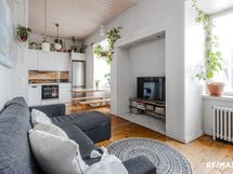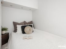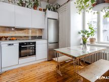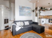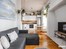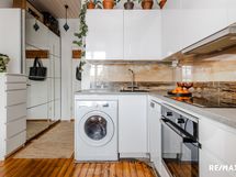 - Keittiön varusteet: Jääkaappipakastin, uuni, liesituuletin, astianpesukone ja pyykinpesukone. Liesi: Induktioliesi. Työtason materiaali: Laminaatti.