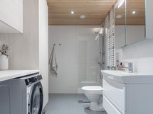 - Varustus: suihkuseinä, pesukoneliitäntä, lattialämmitys, wc-istuin, suihku, peilikaappi, kiinteät valaisimet, kylpyhuonekaapisto.