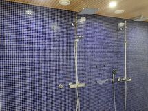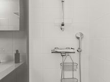 - Koko seinänlevyinen tilava suihku, allaskaappi sekä peilikaappi. Vesikiertoinen kuivauspatteri. Kauttaaltaan laatoitettu kylpyhuone.