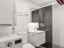 Suihku, Suihkuseinä, Pesukonevalmius, Peilikaappi, Allaskaappi, Rättipatteri, Laattalattia, Halogeenivalot, Laattaseinä, Lattialämmitys, Kuivausrumpu