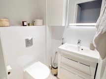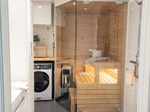 Suihku + kääntyvä suihkuseinä. Pesukonevalmius (kuivaava pesukone voidaan neuvotella kauppaan kuuluvaksi), tila pesutornille. Pystymallinen rättipatteri. Pyykkikaappi, allaskaappi ja led-valopeili. Laattalattia (30x60), laattaseinä (30x60), Led-valaistus. Lattialämmitys (sähkötoiminen, itsesäädettävä ja -ajastettava). Villeroy&Boch -seinä-wc. Opaalilaminoitu kokolasiovi.