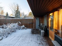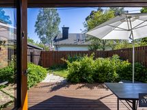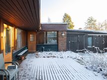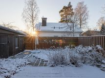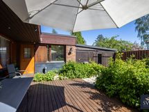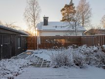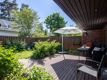 Pihan aidat on uudistettu ja edelleen mukavan korkeat, suojaten pihan rauhaa. Terassi on remontoitu vuonna 2021. Istutusalueet jakavat tilavaa pihaa, kukat kukkivat läpi kevään ja kesän ja keskikesällä voit herkutella omilla vadelmilla.