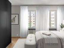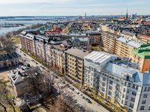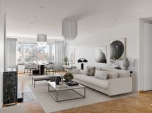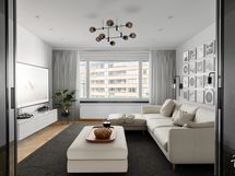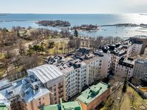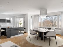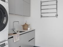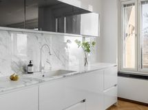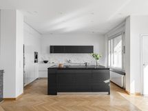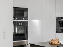 Varustus: integroidut täyskorkeat jääkaappi (Siemens uusittu 2025) ja pakastin, astianpesukone, kahvikone, viinikaappi, kalusteuuni, kalusteisiin asennettu mikro, saarekkeessa induktiokeittotaso liesituulettimella, kivitasot.