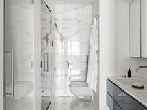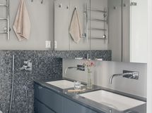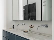 - Pesutilojen kuvaus: Kaksi kylpyhuonetta, toinen master bedroomin yhteydessä. Suuremman kylpyhuoneen takaseinä on tehty yhdestä kahteen osaan jaetusta Staturatio marmorilaatasta. Molempien kylpyhuoneiden peilikaapit on teetetty puusepällä sisustusarkkitehdin piirustusten mukaisesti. Suihkutilassa on kaksi suihkua seinä- ja kattosuuttimilla. Suihkutilojen lasiovet teetetty mittojen mukaan. Kylpyhuoneissa lattialämmitys.