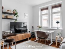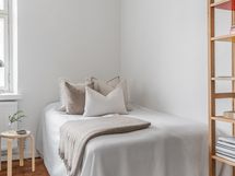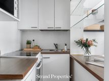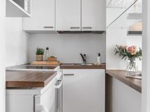 - Työtasot: laminaatti. Siistikuntoinen keittokomero, jossa vaaleat kaapisto, jääkaappi, keraaminen liesi/uuni. Avohyllykkö/saareke joka toimii ruokapöytänä.