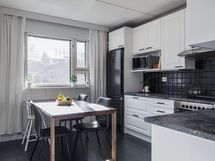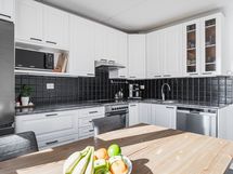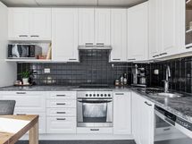 - Keittiön varusteet: Jääkaappipakastin, astianpesukone, liesi ja liesituuletin. Liesi: Keraaminen liesi. Keittiön tumman harmaan sävyt ja valkoiset kaapistot luovat modernin ilmeen.