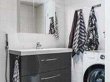 - Pesutilojen varusteet: WC-istuin, suihku, pesukoneliitäntä ja peili. Pesutilojen kuvaus: Kylpyhuone on remontoitu vuonna 2018.