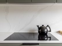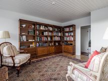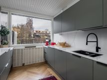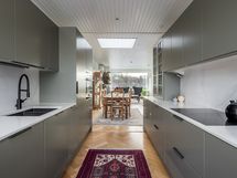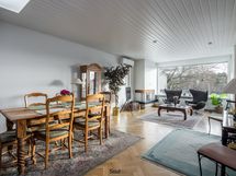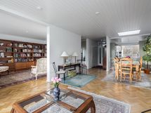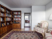 Keittiö, ruokailutila ja olohuone muodostavat yhtenäisen ja valoisan kokonaisuuden, jota kattoikkuna korostaa upeasti. Keittiö on toteutettu tyylikkäästi, ja sen integroidut kodinkoneet sulautuvat kauniisti osaksi modernia ilmettä. Olohuoneen tunnelmaa lisää takka, ja tila jatkuu kirjastohuoneeseen, jonka voi muuttaa myös työ- tai vierashuoneeksi. Olohuoneessa, keittiössä ja eteisessä on kaunis kalanruotoparketti.