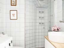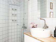 Sadesuihku, suihkuseinä, peili, allas, allaskaappi, pyyhekuivain, avohyllyt seinällä, pk-liitäntä, kiinteät valaisimet.