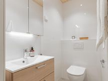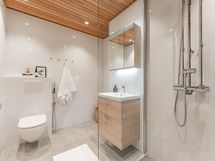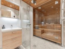 - Sauna, kylpyhuone/wc, erillinen wc, sadesuihku, suihkuseinä, käsisuihkut, peilikaapit, allaskaapit vetolaatikoilla, seinäkiinnitteiset wc-istuimet, lattialämmitys, pesukoneliitäntä, paikka pesutornille, kiinteä led-valaistus