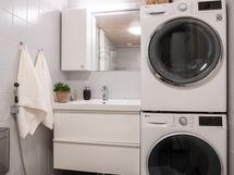- Pesutilojen kuvaus: Varustus: pesukoneliitäntä, lattialämmitys, wc-istuin, suihku, peilikaappi, kylpyhuonekaapisto (allaskaappi ja seinäkaappi). Lattia: laatta. Seinät: kaakeli.