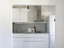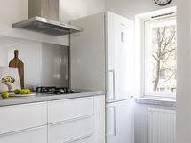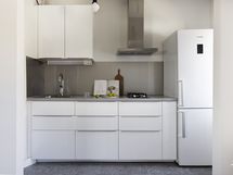 - Liesi: kaasu, erillisuuni. Työtasot: laminaatti. Kylmäsäilytys: jääkaappi/pakastin. Varustus: liesikupu, mikroaaltouuni, astianpesukone, kiinteät valaisimet.