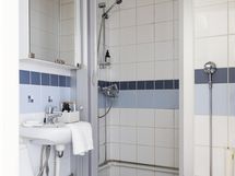 suihku, suihkuseinä, allas, peilikaappi, wc-istuin, pesukoneliitäntä, laatoitettu.