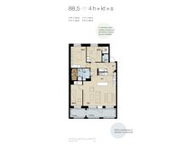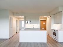 - Keittiössä on induktiokeittotaso, kalustepeitteiset jääkaappi ja pakastin, kalustepeitteinen astianpesukone, kalusteuuni, integroitu mikroaaltouuni ja saareke. Keittiön työtason ja seinäkaapiston välitilassa välitilalevy. Keittiön työtasot ovat laminaattia.