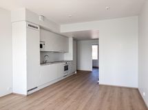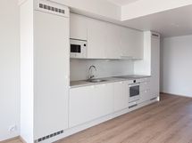 - Keittiössä on induktiokeittotaso, kalustepeitteiset jääkaappi ja pakastin, kalustepeitteinen astianpesukone, kalusteuuni ja integroitu mikroaaltouuni. Keittiön työtason ja seinäkaapiston välitilassa välitilalevy. Keittiön työtasot ovat laminaattia.