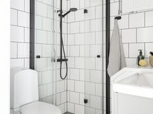 Varustus: sadettajasuihku, käsisuihku, suihkuseinä, allas/allaskaappi, peili, pesukoneliitäntä, pesukone, lattialämmitys, laatoitettu.