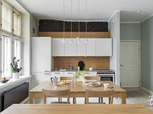 Varustus: integroitu jääkaappi/pakastin, keraaminen liesi, kalusteuuni/mikro, liesituuletin (aktiivihiilisuodatin), integroitu astianpesukone, teräksiset tasot, tilanjakajana senkki.