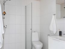 - Pesutilojen kuvaus: Yläkerran kylpyhuone: suihku, suihkuseinä, wc-istuin, pesuallas, allaskaappi, peilikaappi valolla.