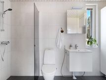 Suihku, suihkuseinä, wc-istuin, peilikaappi valolla, allaskaappi, pesuallas.