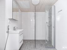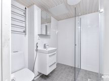 - Pesutilojen varusteet: WC-istuin, suihku, suihkuseinä, allaskaappi, bidee-suihku ja peilikaappi. Pesutilojen kuvaus: Linjasaneerauksen yhteydessä uusittu 2024.