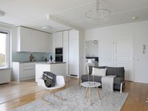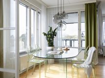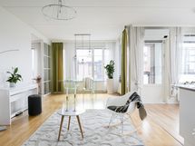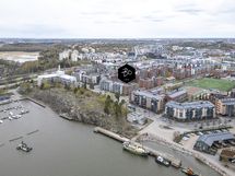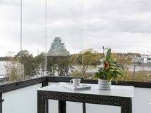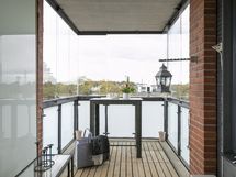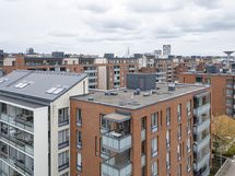 - Lasitettu n. 8 m2 kokoinen parveke, josta näkyvät meri, Kallion kirkko, Linnanmäki ja Kalasatama.