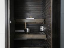 - Kuvaus: Sähkökiuas, tummaksi maalatut seinät, lasiovi saunaan.