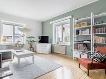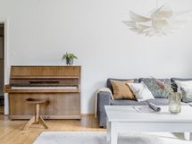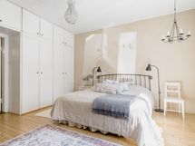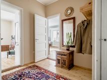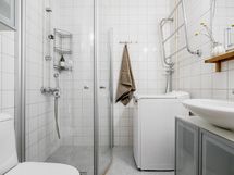 - Kylpyhuone, suihku, suihkuseinä, peilit, kaapit, allaskaappi, pesukoneliitäntä, kiinteät valaisimet. pyyhekuivain