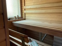 - Sähkökäyttöinen kiuas, lämpöpatteri lauteiden alla, ikkuna ulos, panelointi tervaleppää