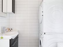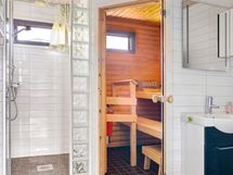 - Kylpyhuone, suihku(lasiovi), peilit, lattialämmitys, pesukoneliitäntä, kylpyhuonekaapisto, kiinteät valaisimet, erillinen wc, sähkösauna