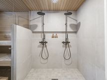 - Pesutilojen kuvaus: Kaikkien kylpyhuoneiden lattia: Pukkila Stone age greige 10*10 vaaleanruskea.