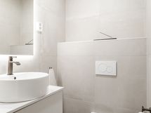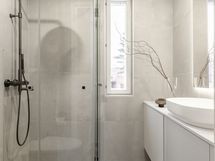 Lasitettu porcelanato 60*60 kalkki. Varustus: lattialämmitys, wc-istuin, suihku. Erillisen WC:n kuvaus: Ala kerran wc: Ido Seven D Image.